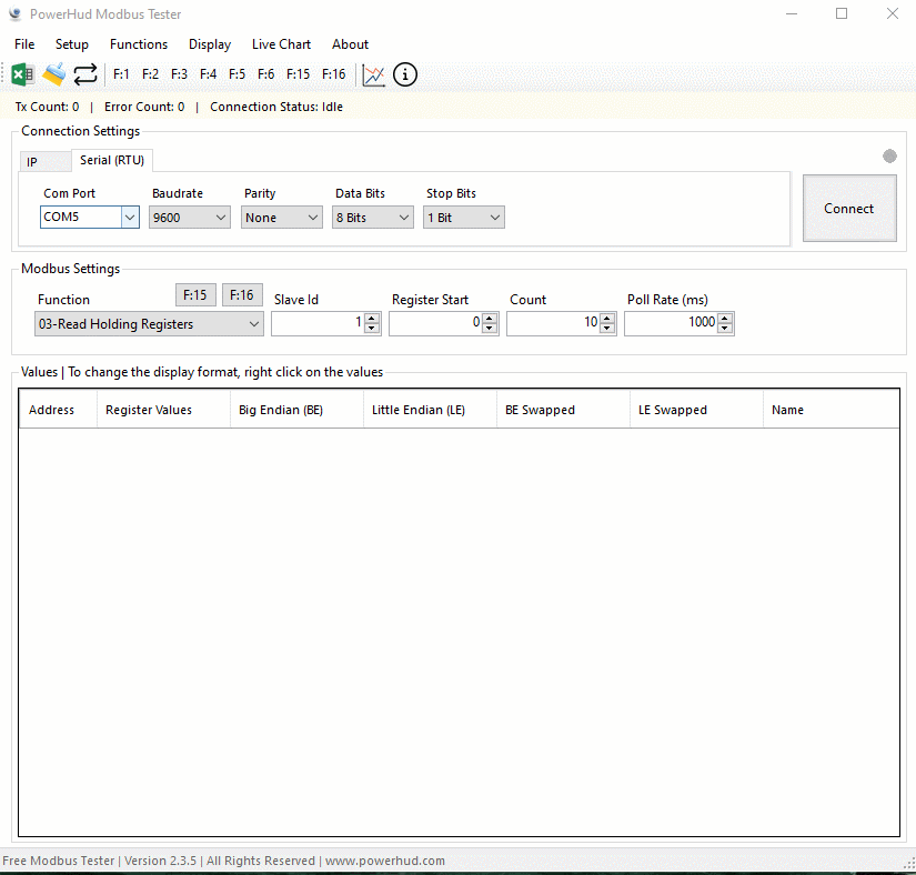 const uint8_t registerCount = 10; // Количество регистров (5 float × 2 регистра = 10)- Устройство настроено как Slave с ID = 1.
