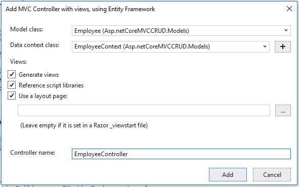 Созданный контроллер MVC будет иметь все методы действий для всех операций CRUD, хотя я хотел бы упростить его следующим образом. Каждый из методов действия будет рассмотрен далее в этой статье.