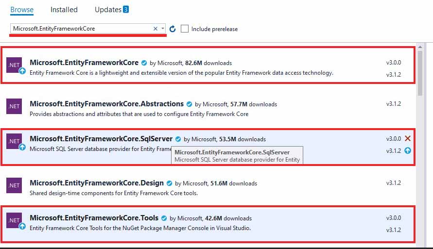 База данных для проекта будет создаваться и управляться с помощью EF Core — Code First Approach. Итак, прежде всего, мы должны установить соответствующие пакеты NuGet. Щелкните проект правой кнопкой мыши в обозревателе решений и выберите Управление пакетами NuGet. На вкладке обзора найдите и установите Microsoft.EntityFrameworkCoreи зависимые от него пакеты.