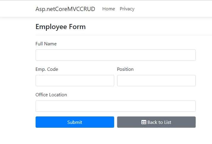}Это представление возвращается AddOrEditметодом действия типа GET. Метод возвращает свежий экземпляр модели сотрудника, если idпараметр равен 0. idВ противном случае возвращается соответствующая запись сотрудника с данным . Наконец, возвращенная модель заполняется внутри AdddOrEdit.cshtmlпредставления. Для операции вставки форма выглядит следующим образом.