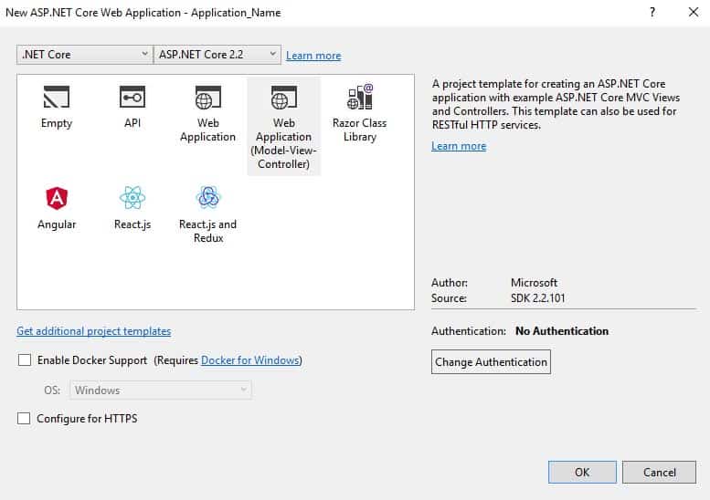 В мастере шаблонов выберите шаблон веб-приложения (MVC). Обязательно выберите последнюю версию ASP.NET Core в верхнем раскрывающемся списке. Снимите флажок HTTPS, который не требуется в среде разработки.