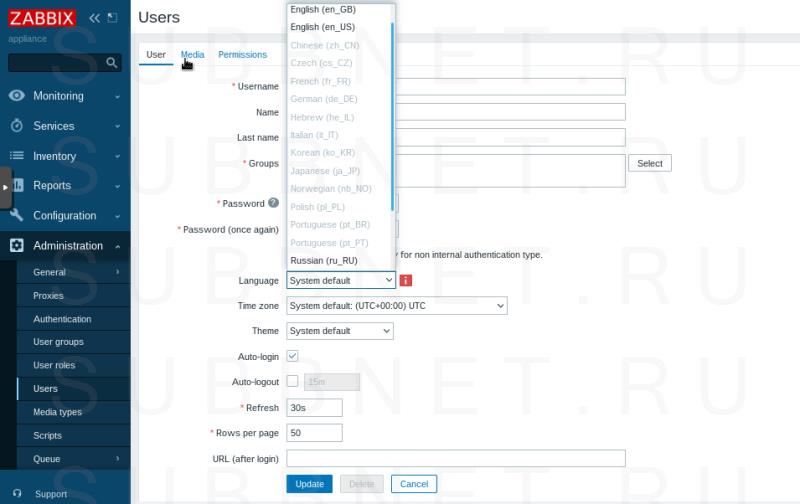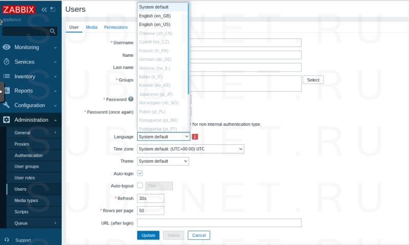 Выбираем Russian (ru_RU) и нажимаем Update (для принятия изменений), изменения о смене языка интерфейса применяться сразу же, в результате интерфейс управления ZABBIX изменится на русский язык.