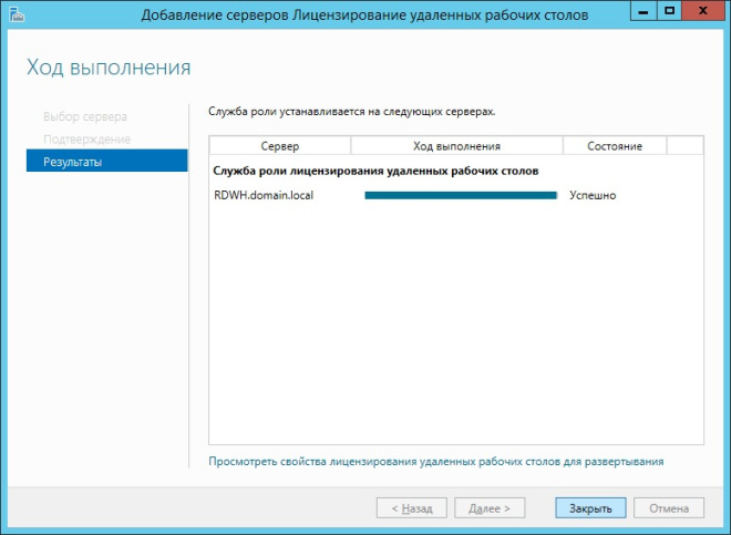 В окне с результатами работы мастера можно перейти по ссылке Посмотреть свойства лицензирования удалённых рабочих столов для развёртывания и настроит базовые параметры серверов лицензирования.