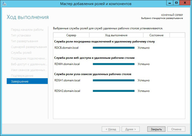 На этом процедура развёртывания заканчивается, однако, для эффективного функционирования служб RDS, необходимо выполнить еще несколько настроек, в числе которых: создание коллекций сеансов, публикация приложений RemoteApp, добавление к ферме RDS шлюза для организации доступа клиентов из внешней сети к приложениям RemoteApp по защищенному протоколу, настройка отказоустойчивости посредника подключений и т.д.