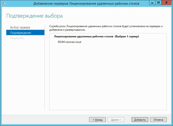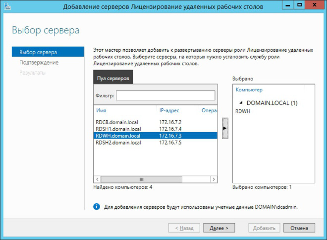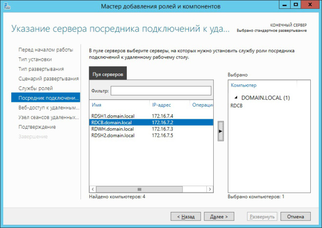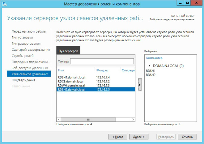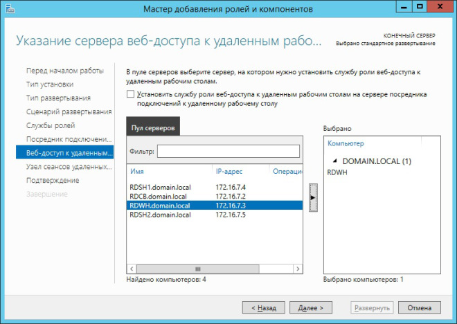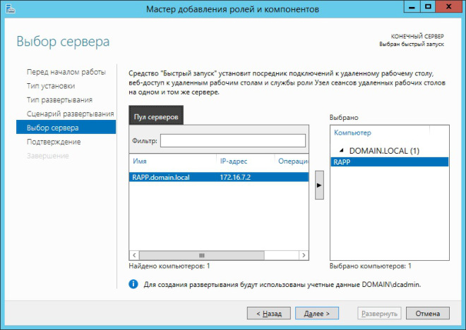 В следующем окне мастера предлагается выбрать сервер, на котором будут развернуты службы RDS. В нашем случае это сервер RAPP.domain.local. После того, как выбор сделан, жмём Далее.