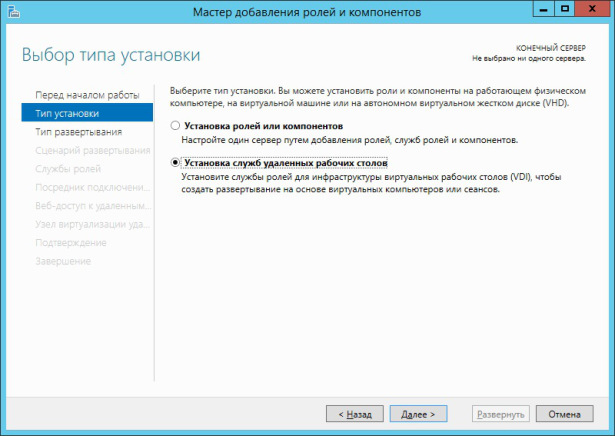 В следующем окне предлагается выбрать тип установки. Отмечаем пункт Установка служб удалённых рабочих столов.