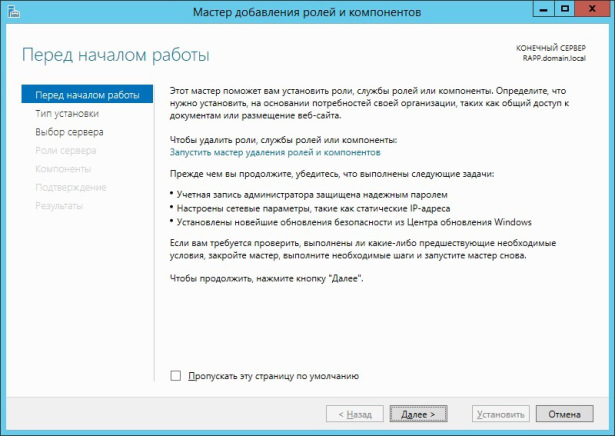 На сервере RAPP необходимо открыть Диспетчер серверов. Для этого можно нажать на соответствующую иконку на панели задач или выполнить команду servermanager.exe В окне диспетчера выбираем Управление —Добавить роли и компоненты, после чего откроется окно мастера добавления ролей и компонентов. В первом его окне предлагается ознакомиться с основными требованиями к серверам, на которые будут устанавливаться роли. Также здесь можно установить галочку, которая позволит пропускать эту информацию при добавлении новых компонентов и ролей. При частой установке бывает полезно её установить. Прочитав информацию нажимаем Далее.