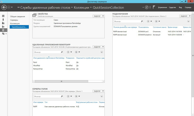 Однако, поскольку коллекции сеансов мы не создавали и приложений RemoteApp не публиковали, а по умолчанию они не создаются, увидеть работающее приложение не получится. Создание коллекций и публикация приложений будут рассмотрены в одной из следующих статей.