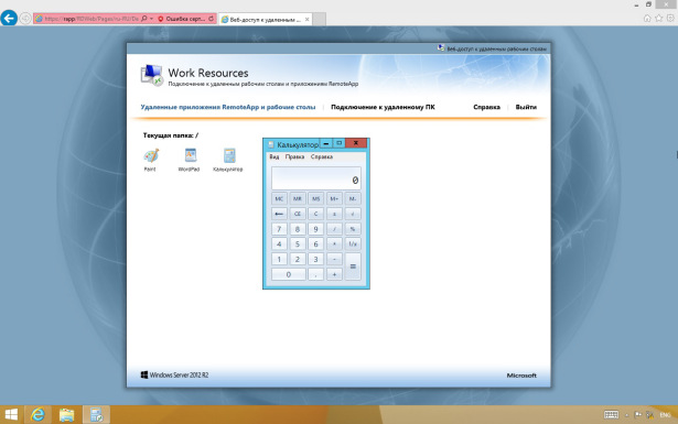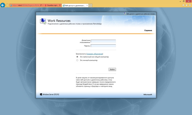 Проверим работу веб-доступа к удалённым приложениям. Для этого перейдем по ссылке, которую мы получили в процессе работы мастера установки ролей и компонентов — https://rapp.domain.local/rdweb