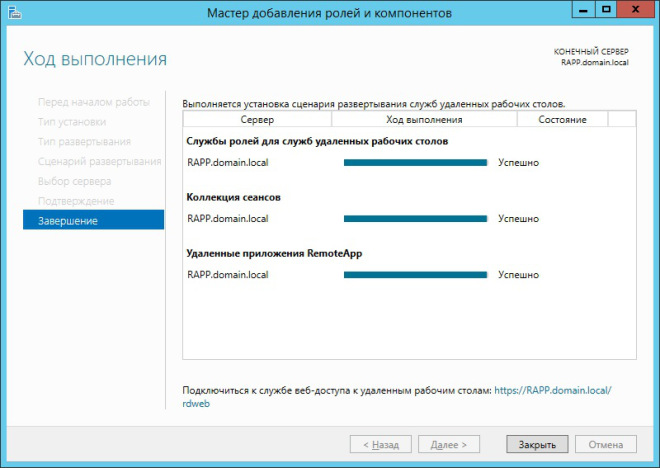 После завершения установки, мастер отрапортует о состоянии всех служб и сообщит ссылку для организации веб-доступа к удалённым рабочим столам.