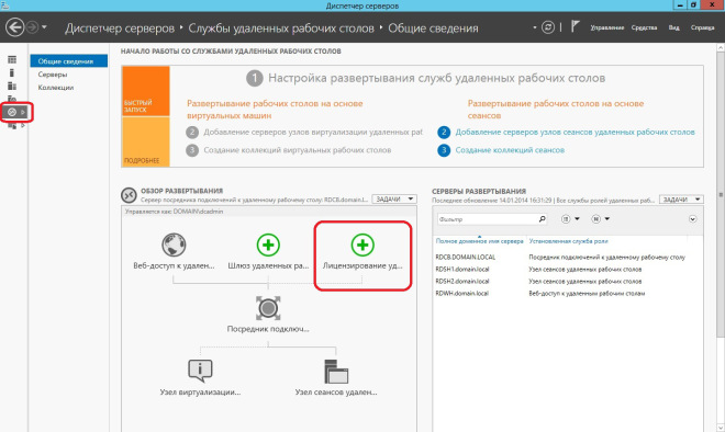 Для этого, запустим Диспетчер серверов, если он не запущен, и перейдём в консоль управления удалёнными рабочими столами, кликнув на соответственную ссылку слева. Для запуска необходимого мастера кликнем на зелёную кнопку с плюсом и подписью Лицензирование удалённых рабочих столов на панели Обзор развёртывания.