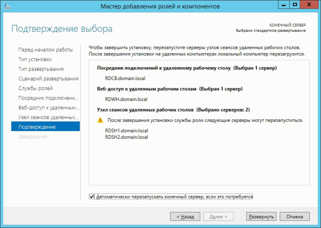 После указания всех серверов на предыдущих шагах, мастер отобразит окно подтверждения сделанного выбора, в котором можно убедиться, что роли будут установлены на правильные серверы. Так же здесь необходимо установить галочку Автоматически перезапускать конечный сервер, если это потребуется. Т.к. на сервере, с которого будет производиться развёртывание, не будет установлена роль узла удалённых рабочих столов, то он перезагружаться не будет, а вот остальные серверы выполнят перезагрузку в автоматическом режиме. Как мне кажется, это очень удобно и правильно организовано.