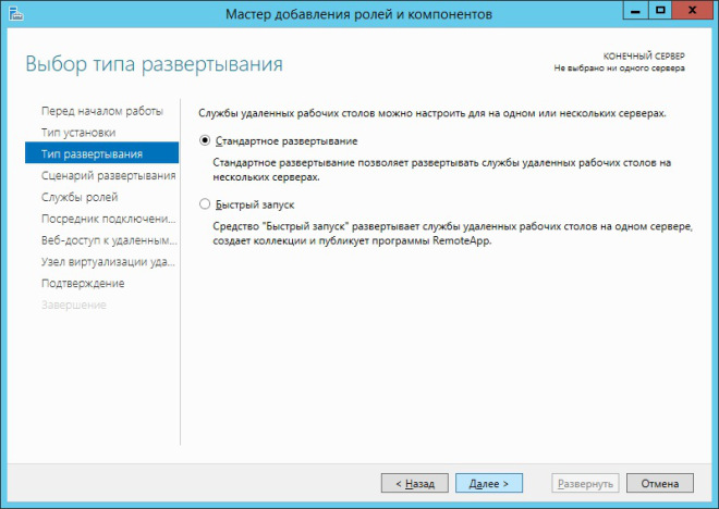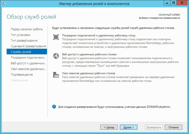 Как уже говорилось выше, стандартное развёртывание обеспечивает более гибкую установку служб удалённых рабочих столов, что позволяет разносить отдельные службы RDS на отдельные серверы инфраструктуры.