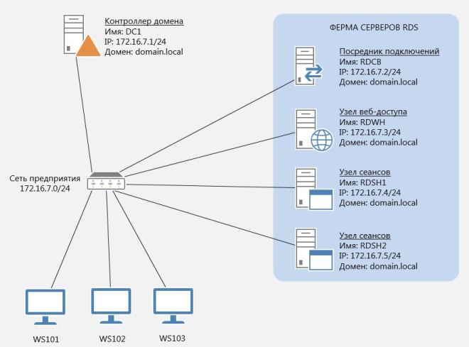 Перед тем, как начать установку RDS на сервер необходимо ознакомиться с существующей инфраструктурой сети. В данном случае, это тестовая сеть, состоящая из контроллера домена DC1 со статическим адресом 172.16.7.1/24, сервера на который будут установлены службы RDS — RAPP, с адресом 172.16.7.2/24 и рабочих станций WS101, WS102, WS103, получающих IP-адреса по DHCP. Все компьютеры сети подключены к домену domain.local