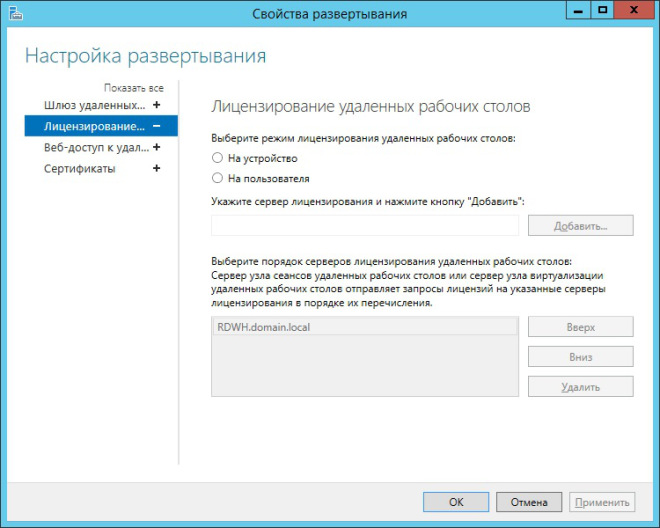 К этим параметрам относятся режим лицензирования, добавление новых серверов лицензирования и порядок выдачи лицензий серверами лицензирования. К сожалению, управлять непосредственно лицензиями из этого окна не получится. О том, как этот процесс правильно организовать будет рассказано в одной из следующих статей посвященных теме RDS.