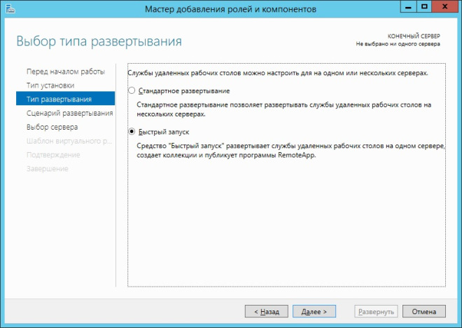 Таких сценариев будет рассмотрено всего 2 и выбор применения конкретного варианта, в большинстве случаев, зависит от существующей инфраструктуры серверов. Сценарий первый — Быстрое развёртывание. Это упрощённый способ установки службы удаленных рабочих столов, в котором все роли RDS устанавливаются на одном физическом сервере. Второй способ — это установка ролей удалённых рабочих столов на разные физические серверы. Такой сценарий предлагается называть Стандартное развёртывание. Следует отметить, что быстрое развёртывание является частным случаем развёртывания стандартного. Говоря иными словами, выполнить установку всех ролей RDS на один сервер можно и с помощью сценария стандартного развёртывания. Давайте рассмотрим каждый из описанных выше сценариев более подробно.