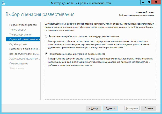В следующем окне мастера выбираем пункт Развёртывание рабочих столов на основе сеансов.