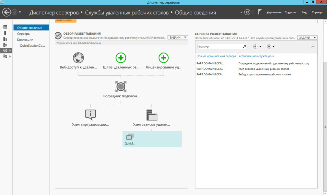 После завершения установки, в консоли управления удалёнными рабочими столами, на вкладке Общие сведения можно увидеть схему развёртывания и список серверов, на которые установлены различные роли RDS.