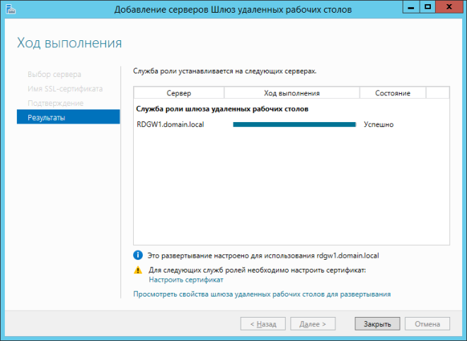 Когда сертификат успешно создан и применен, из окна Ход выполнения (рис.7) можно перейти к свойствам шлюза удалённых рабочих столов. К этим же свойствам можно получить доступ и через Свойства развёртывания.