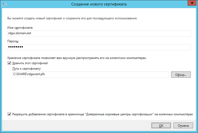 При создании нового сертификата указываем внешнее доменное имя, по которому будут подключаться пользователи, пароль и место хранения сертификата. Кроме всего этого, необходимо установить галочку Разрешить добавление сертификата в хранилище «Доверенные корневые центры сертификации» на конечных компьютерах. Это необходимо для того, чтобы на клиентских компьютерах сертификат можно было установить вручную.