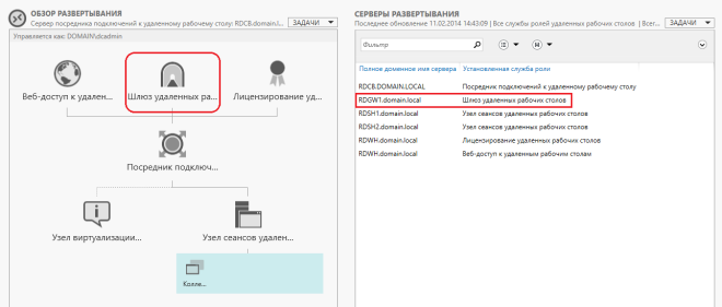 После того, как служба шлюза удалённых рабочих столов была успешно установлена на выбранный сервер, во вкладке Общие сведения окна Службы удалённых рабочих столов в Диспетчере серверов можно увидеть, что иконка шлюза в обзоре развёртывания изменилась и приобрела вид туннеля, а на панели Серверы развёртывания добавился новый сервер.