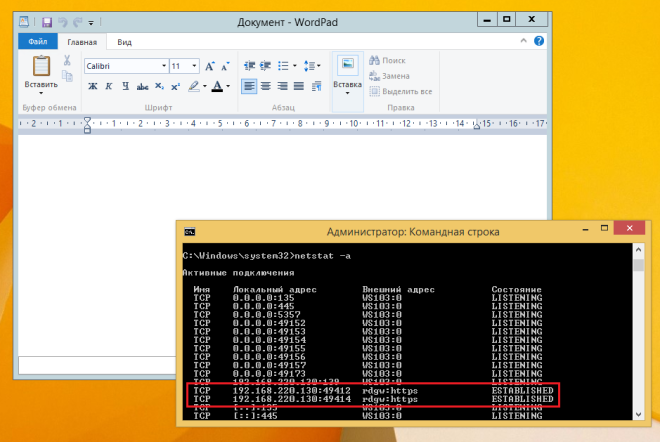 Для того, чтобы убедиться, что защищенное соединение действительно работает, воспользуемся средствами утилиты netstat. Для этого в командной строке введем netstat -a. Как видим, среди прочих, присутствуют 2 установленных защищенных протоколом HTTPS соединения с узлом rdgw. Вот это и есть подключение к шлюзу удалённых рабочих столов.