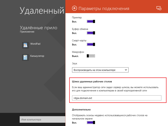 На Windows RT и Windows 8/8.1 можно осуществлять подключение с помощью приложения Удалённый рабочий стол. Для того, чтобы указать сервер шлюза, через который будет установлено подключение, необходимо зайти в настройки приложения. Сделать это можно в окне приложения, нажав комбинацию клавишWin+I, или зайдя в пункт Параметры панели Charms. Из панели параметров необходимо перейти в Параметры соединения, где, среди прочих настроек, можно указать параметры шлюза удалённых рабочих столов.