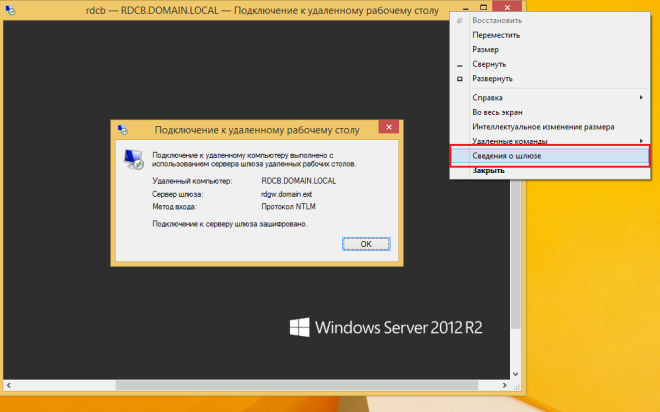 Если пользователь получает доступ к полному удалённому рабочему столу, то в свойствах подключения можно посмотреть информацию касательно шлюза. Сделать это можно с помощью пункта Сведения о шлюзе контекстного меню окна соединения.