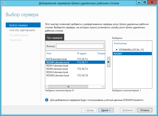 Любое из описанных выше действий приведёт к вызову мастера установки роли шлюза удалённых рабочих столов. В первом окне выбираем сервер или несколько серверов на которые будет установлена роль RD Gateway.