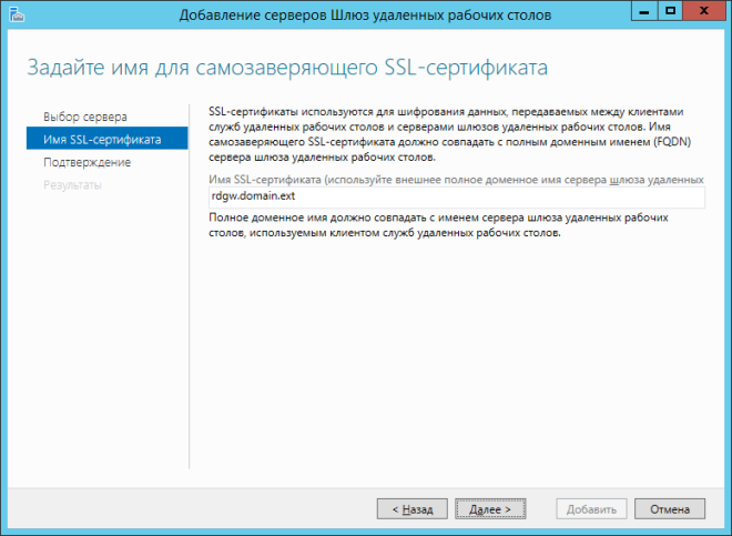 После выбора серверов, роли шлюза необходимо присвоить самозаверяющий SSL-сертификат. В поле для ввода указываем полное внешнее имя к которому будут подключаться клиенты. В данном случае рассмотрен наипростейший вариант, в котором организация имеет зарегистрированное доменное имя domain.ext и к серверу шлюза можно обратиться по имени rdgw.domain.ext.