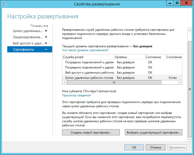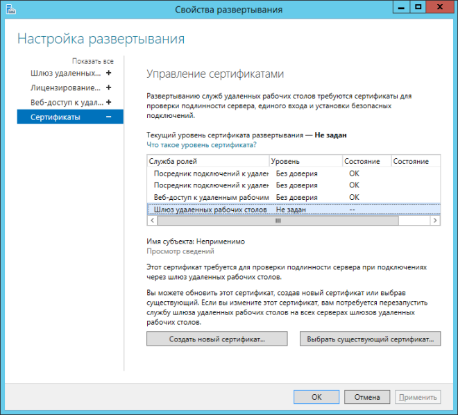 В окне управления сертификатами, для роли шлюза удалённых рабочих столов, как и для прочих, можно задать уже существующий сертификат или создать новый. Так как в данном цикле статей не рассматриваются вопросы функционирования центров сертификации, то создадим новый самоподписанный сертификат. Для этого выбираем пункт Шлюз удалённых рабочих столов и затем Создать новый сертификат.