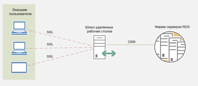 Шлюз удалённых рабочих столов представляет собой сервис посредника между клиентами из внешней сети и коллекцией сеансов, которая расположена во внутренней сети предприятия, и обеспечивающий безопасный обмен данными между ними.