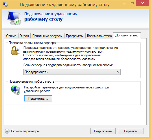 Все настройки клиента относительно использования шлюза выполняются в окне Подключения к удалённому рабочему столу (mstsc.exe). Для того, чтобы задать клиенту параметры подключения к шлюзу, необходимо на вкладке Дополнительно в разделе Подключение из любого места нажать кнопку Параметры.