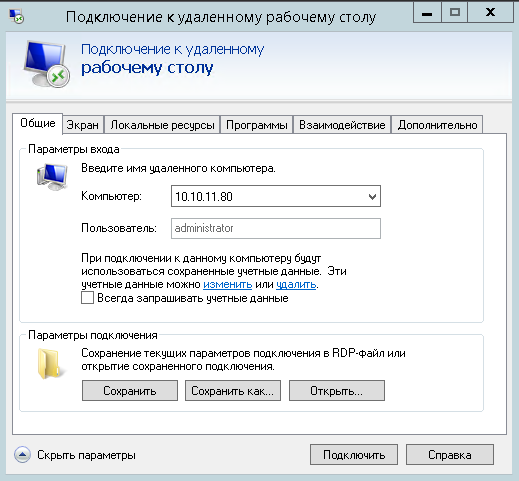 Нажимаем Win+R и набираем mstsc.  Настраиваем соединение с нашим сервером.