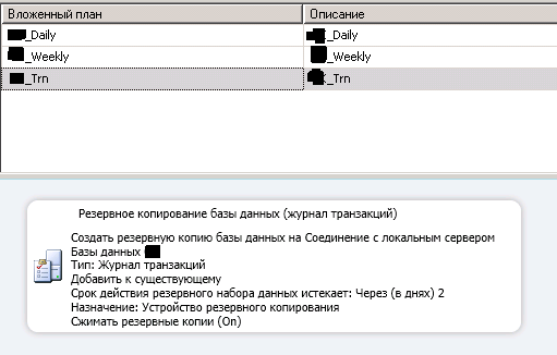 Подплан для резервирования ЖТ, состоит из одной задачи "Резервное копирование базы данных".ЖТ для меня удобнее сохранять не в Устройство резервного копирования, а в отдельный файл, что необходимо указать в настройке задачи.