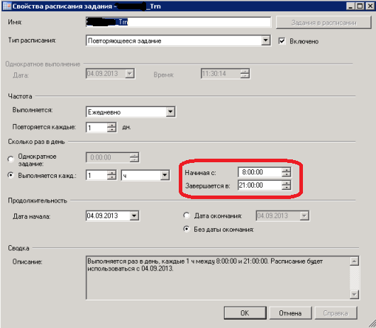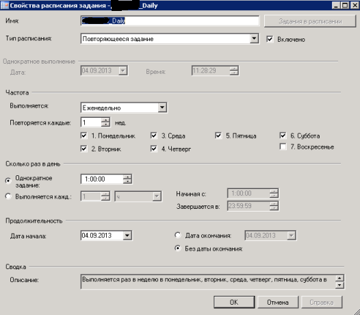 Настройка дневного расписания. Недельное отличается только установленной галочкой "Воскресенье" и снятыми с "понедельника" по "Субботу"