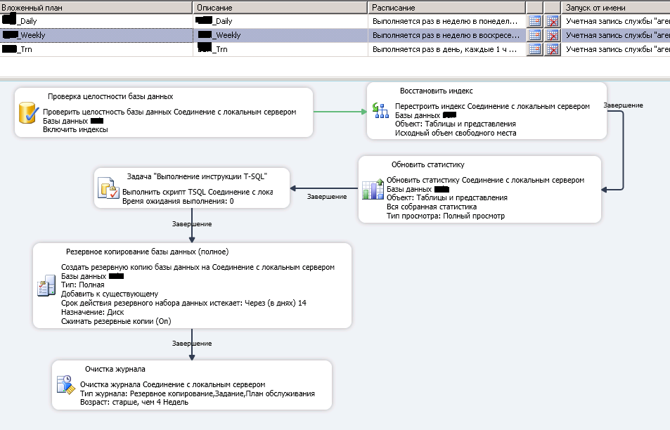 Задачи. В каждую задачу нужно зайти и выбрать БД, для которой она будет выполняться и ряд других настроек (если есть). Рассмотрим, какие задачи содержит недельный подплан нашего плана обслуживания.