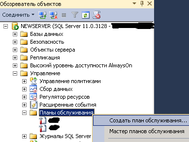 Теперь можно приступать к настройки Плана обслуживания (Maintenance Plan). План Обслуживания можно создать сразу для всех БД, но удобнее для каждой БД создать свой план обслуживания.