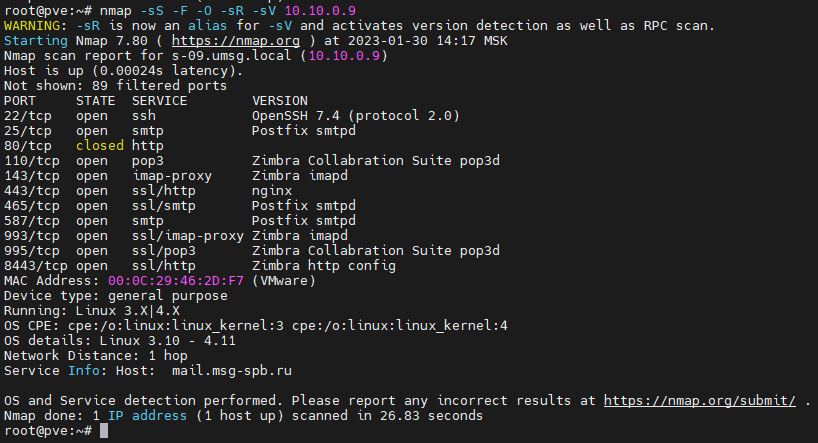 Чтобы узнать более подробную информацию о машине и запущенных на ней сервисах вы можете использовать опцию -sV. Утилита подключится к каждому порту и определит всю доступную информацию: