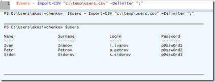 $Users = Import-CSV “c:\temp\users.csv” –Delimiter “;”Чтобы проверить, как прошел импорт – можно посмотреть, что хранится в переменной $Users.