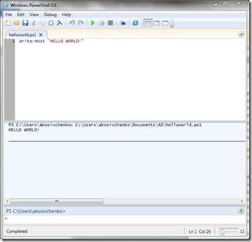 Теперь можно проверить работу скриптов – написать простейший скрипт «Hello World!». Я предпочитаю пользоваться PowerShell ISE, хотя можно писать и в простейшем Notepad’е. PowerShell ISE – удобная среда программирования для PowerShell с возможностью отладки. Входит в состав ОС Wondows 7 и 2008 R2. В общем, рекомендую.