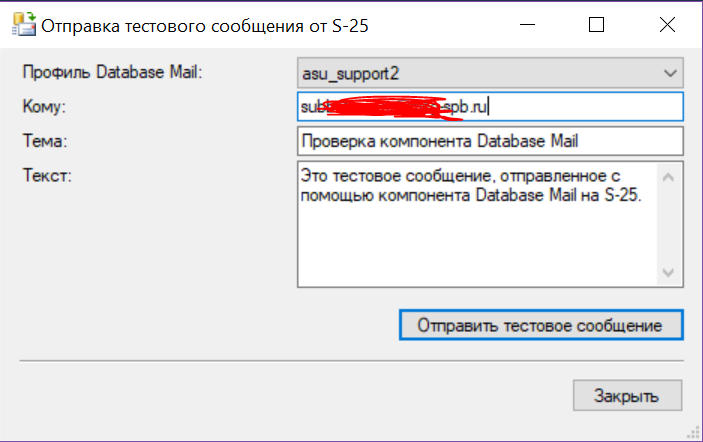 После того как профиль настроен, его надо проверить, для этого в контекстном меню пункта «Компонент Database Mail»(вызываемым щелчком правой мыши по данному пункту) надо выбрать «Отправить тестовое сообщение» (Send Test E-Mail). В открывшемся окне следует заполнить поле «Кому» (To) и нажать «Отправить …» (Send …)