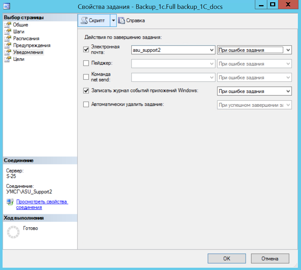 Теперь перейдем к настройке оповещений в «Заданиях» (Jobs). Откроем свойства нашего задания и перейдем на вкладку «Уведомления» (Notifications). Установим галки рядом с видами уведомлений, которые мы хотим использовать (у меня это только электронная почта), далее выберем оператора и условие оповещения (успешное завершение/завершение с ошибкой/любое завершение).