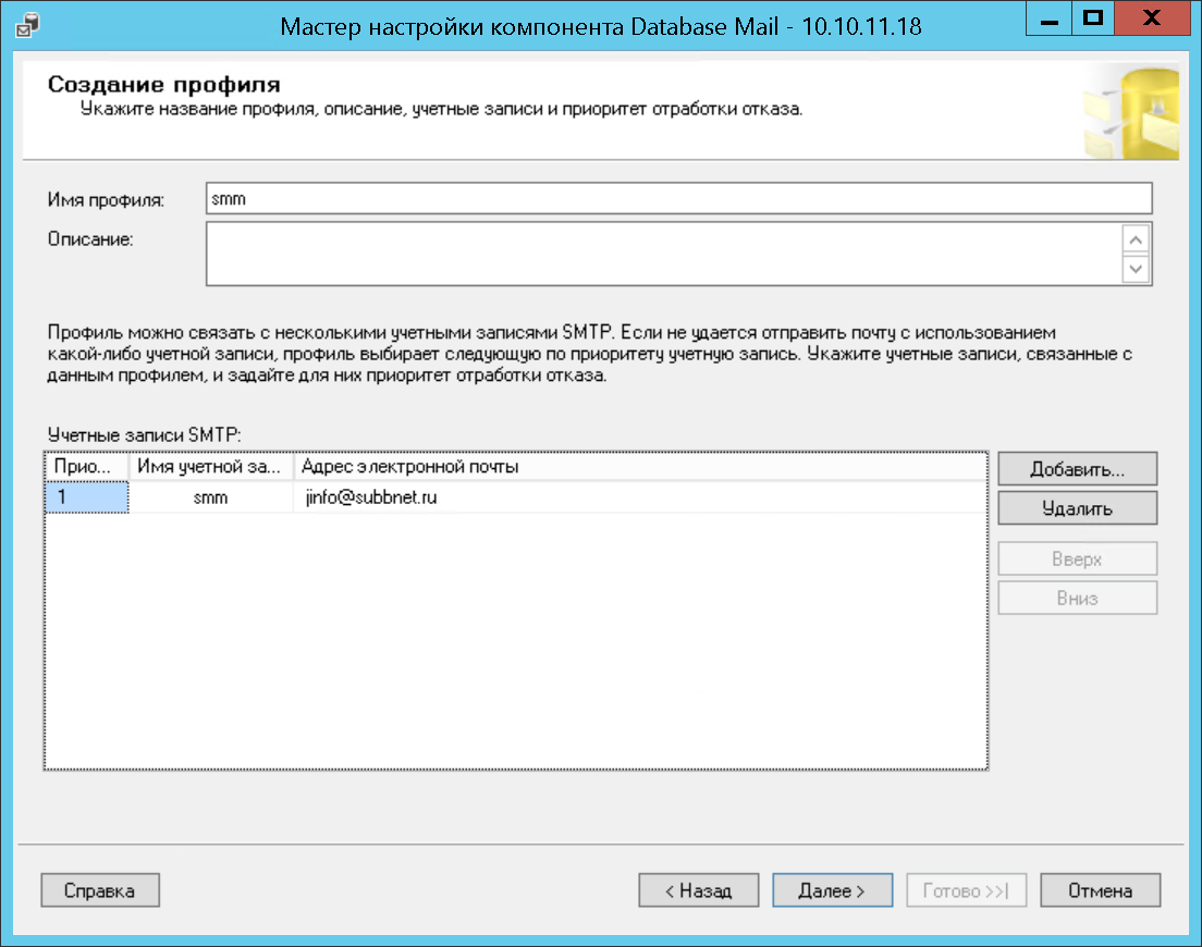 Первую страницу можно пропустить, поэтому перейдем сразу ко второй. Здесь нам необходимо выбрать первый пункт «Установить компонент Database Mail…» (Setup Database Mail…) и нажать «Далее» (Next). На третьей странице задаем имя и описание профиля, затем нажимаем кнопку «Добавить» для добавления учетной записи SMTP. В открывшемся окне необходимо заполнить данные учетной записи (e-mail адрес, сервер и порт SMTP, а так же параметры аутентификации).