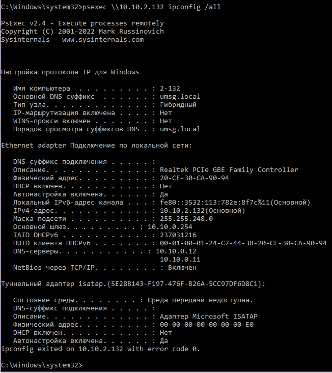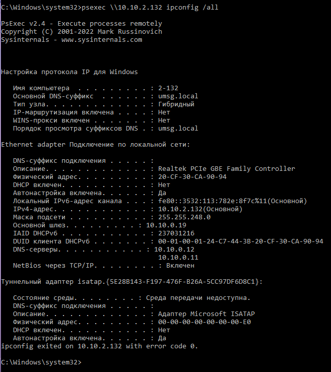 psexec \\10.10.2.132 ipconfig /all