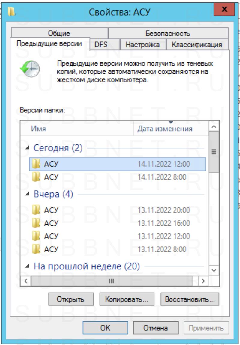 Если через некоторое время открыть свойства общей папки и перейти на вкладку «Предыдущие версии», то можно увидеть список доступных на данный момент теневых копий.