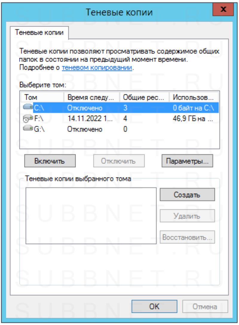 Затем нужно включить теневое копирование для раздела, на котором хранятся общие сетевые папки. Для этого выберите нужный том и нажмите кнопку «Включить». В этот момент будет создана первая теневая копия раздела (снапшот).