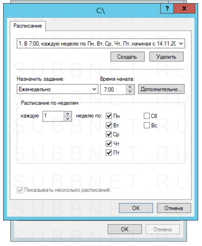 В данном примере настроим создание теневых копий по следующей схеме: снапшоты общих папок должны создаваться ежедневно в течении рабочего дня (с 9:00 до 19:00) каждые 10 минут. Вы, естественно, основываясь на особенности бизнес-процессов компании, можете настроить собственное расписание.