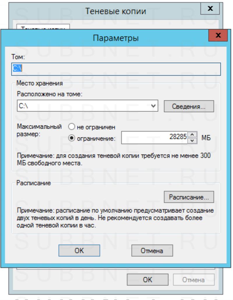 - Под теневые копии система выделяет 10% емкости раздела, однако это значение можно изменить.