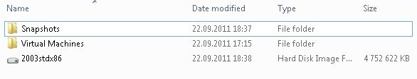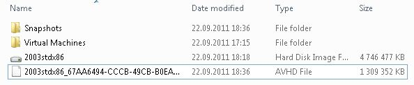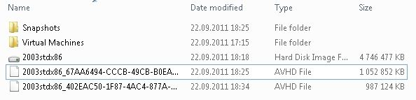 Первый файл – 2003std86.vhd – представляет собой состояние виртуальной машины на момент создания снимка “with Outlook”, второй файл представляет собой изменение состояния виртуальной машины на момент создания снимка “win2003test”, ну и в третьем файле находится изменение состояния виртуальной машины на текущий момент со времени предыдущего снимка.